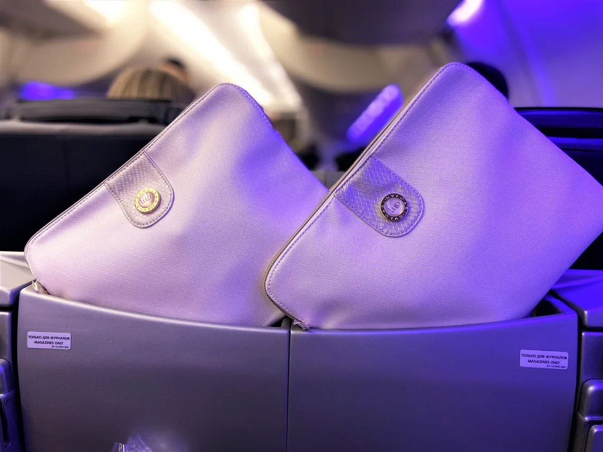 Как и положено в бизнес-классе, для каждого из пассажиров предусмотрены персональные подушки и одеяло.Стильный аксессуар, который порадует всех, это фирменный косметический набор от Bvlgari.