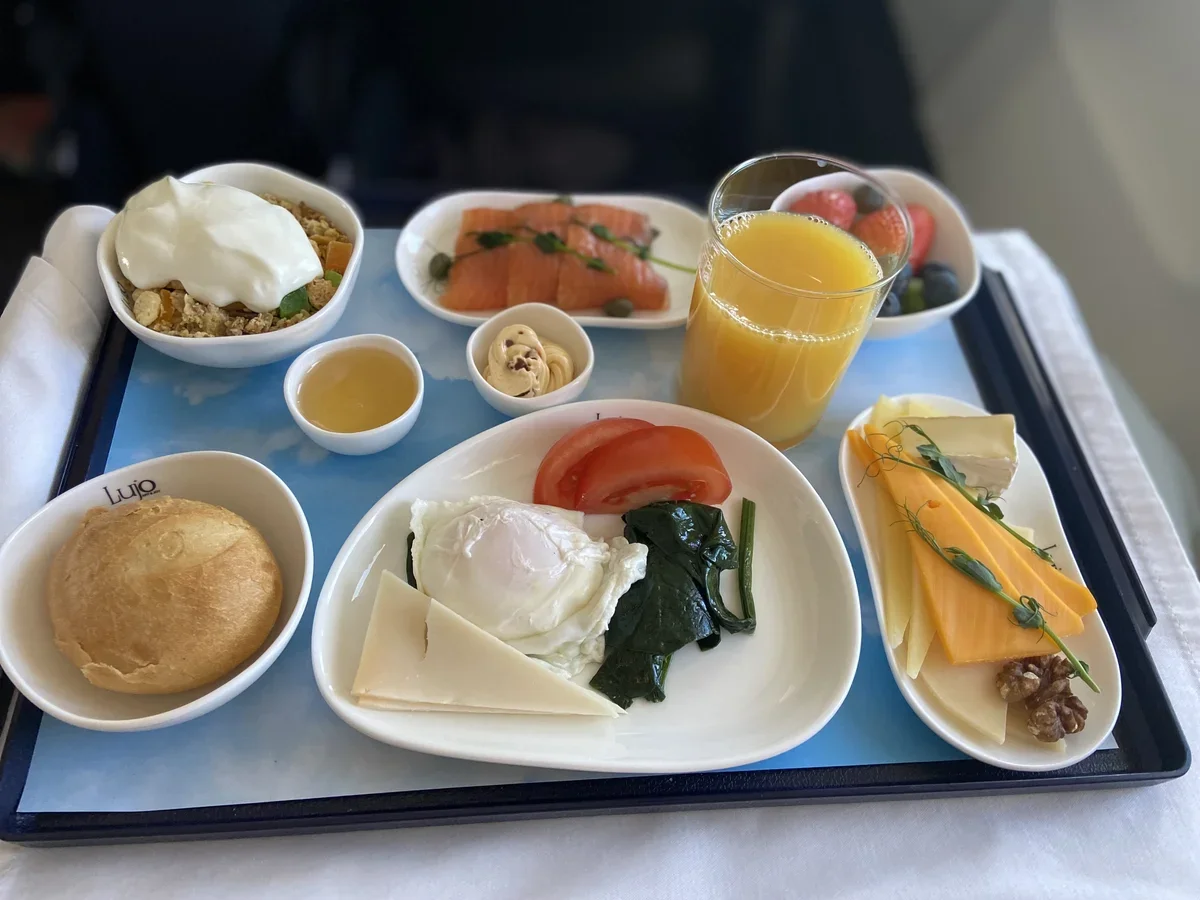 Гостям бизнес-джета предложат ужин и завтрак. На ужине выбор из двух основных блюд – мясо (вкуснейшая баранина) и рыба (лосось на подушке из шпината), сырная тарелка с медом, овощная закуска, красная рыба, соусы, булочки.