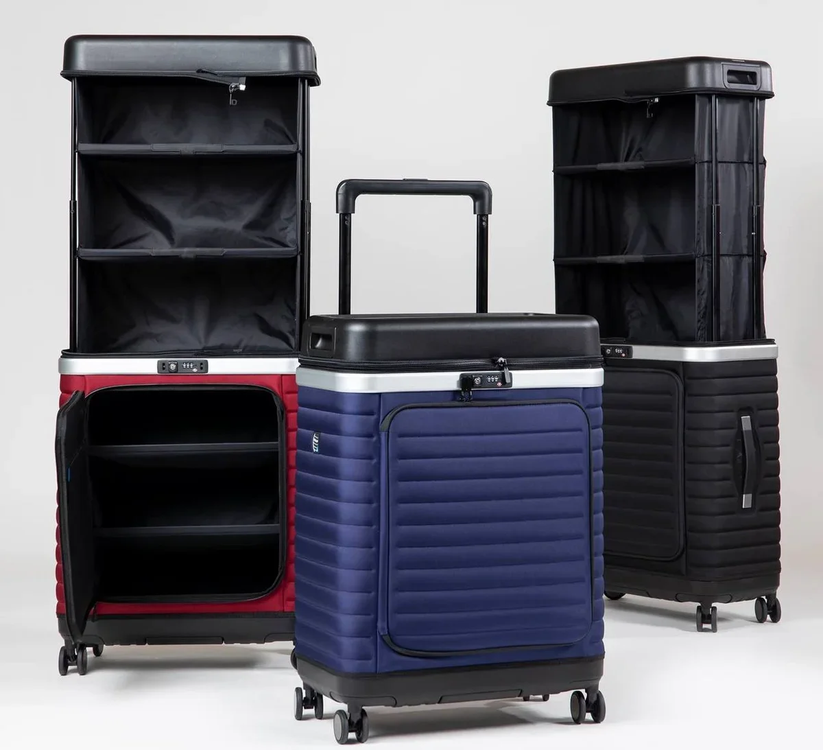 При этом в сложенном виде этот чемодан выглядит вполне привычно и имеет стандартные размеры – 57x76x36 см. Трансформация в шкаф происходит с помощью телескопических ручек, образующих его каркас. В ручки встроены шесть полочек для вещей, таким образом, в коротких поездках путешественник может не тратить свое время и не переносить вещи в шкаф отеля.