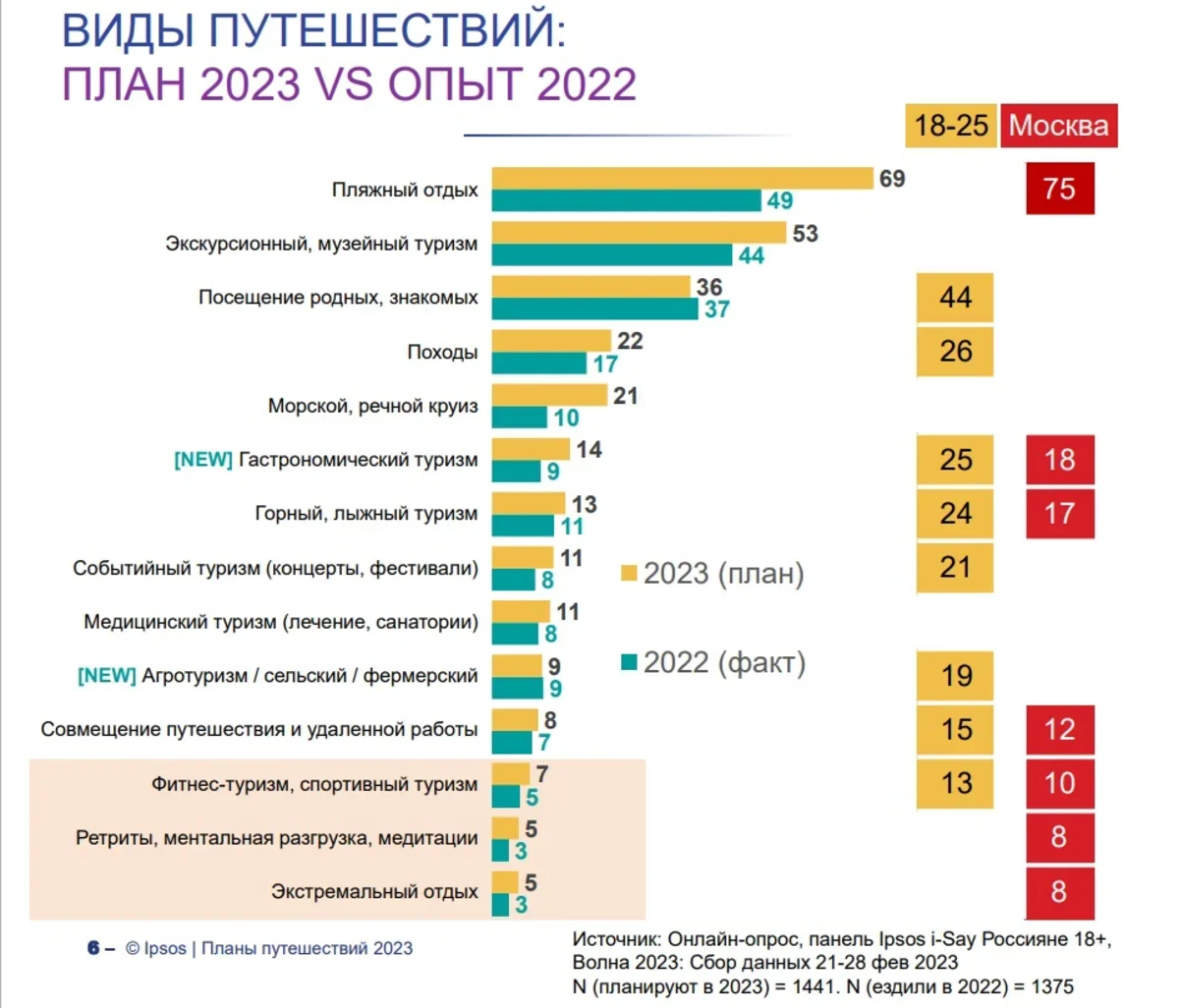 Согласно данным Ipsos, в 2023 году из тех, кто планирует путешествия, 69% выбирают пляжный отдых (по факту в 2022 на пляжных курортах провели отпуск 49% из тех, кто путешествовал). Это по-прежнему самый распространенный и желаемый россиянами вид путешествий и отдыха.