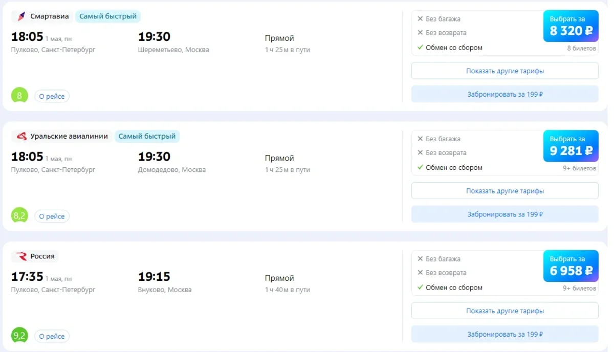 Тарифы на перелет Москва – Санкт-Петербург на 6 мая (начало «вторых майских» ) на утренние рейсы от 11 до 30 тыс. руб. К вечеру ситуация выравнивается, можно улететь за 5-9 тыс. руб.