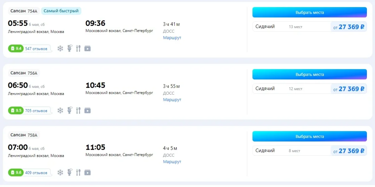 Билеты на поезда с прибытием в Петербург 7 мая утром очень ограничены, но пока доступны по цене от 3,5 тыс руб.