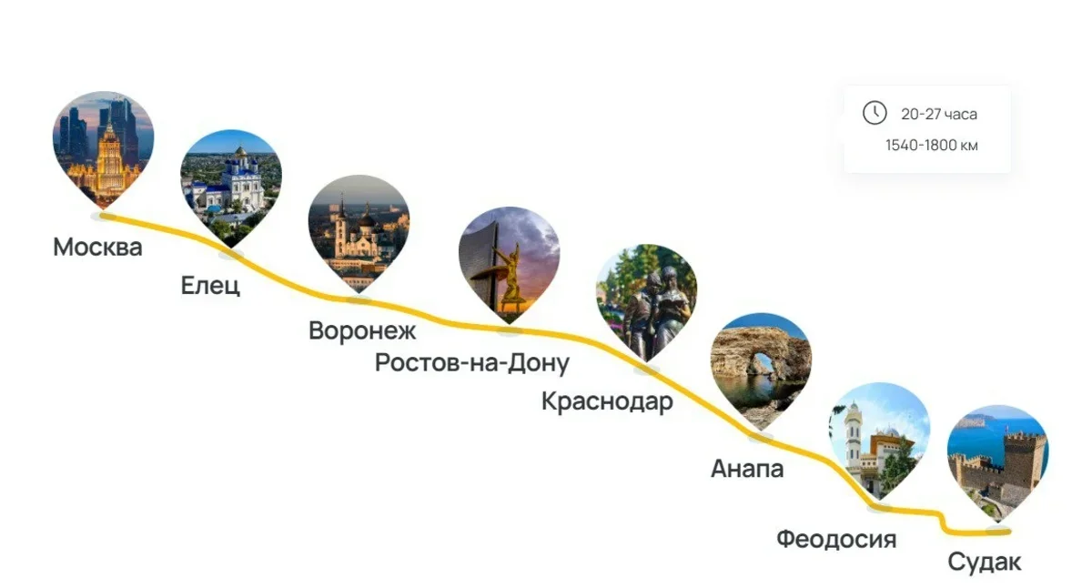 Маршрут автобуса идет из Москвы по трассе М4 Дон, мимо городов Елец, Воронеж, Ростов-на-Дону, Краснодар, туристов доставят в свой отель прямо в город Анапу (плюс курортный поселок Витязево) , Лермонтово, Джубга, Новомихайловка (Туапсинский район), а также в Крым (в Судак и Феодосию).