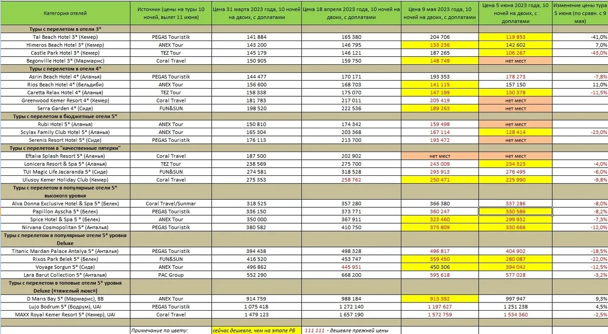 - Цены на этапе раннего бронирования турецкими отелями во многих случаях оказались непропорционально завышенными, особенно в сегменте 3*, бюджетных 5* и отелей уровня «делюкс». В итоге ряд объектов столкнулся с недозагрузкой и пытается стимулировать спрос последовательными спецпредложениями, снижая цену. В некоторых случаях )особенно в 3*) и в ряде отелей «делюкс» видно уже откровенное «горение». Поэтому сейчас у туристов есть много выгодных шансов купить тур по сниженной цене с вылетом в ближайшие выходные.