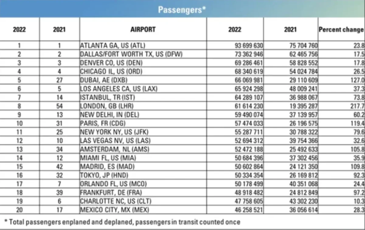 Пятерку рейтинга замыкает Международный аэропорт Дубай, с пассажиропотоком в 66,1 млн, это на 127% больше показателей позапрошлого года. Таким образом, дубайский аэропорт переместился с 27 места рейтинга самых загруженных авиагаваней мира, который составлялся по итогам 2021 года.