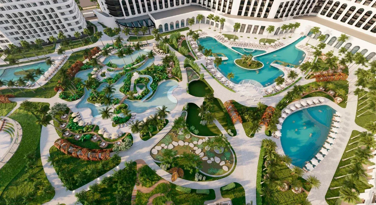 В новом отеле будет сразу 11 бассейнов: 10 открытых, включая 3 бассейна, расположенных на крыше, и 1 закрытый. Все бассейны – с морской водой глубоководного забора. Для бизнес-туризма в отеле будет работать многофункциональный конгресс-центр, способный вместить до 1200 человек единовременно.