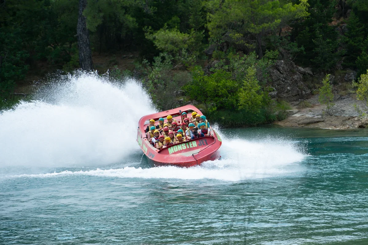 На станцию Monster Travel нас отвозят на огромном вездеходе Monster Truck. Прибыв на место и нацепив каски и спасжилеты, загружаемся в скоростной сверхмощный катер Monster Jet, крепко хватаемся за поручень и улетаем по реке в направлении каньона. Телефоны и личные вещи приходится оставить в шкафчике, чтобы не растерять по дороге.