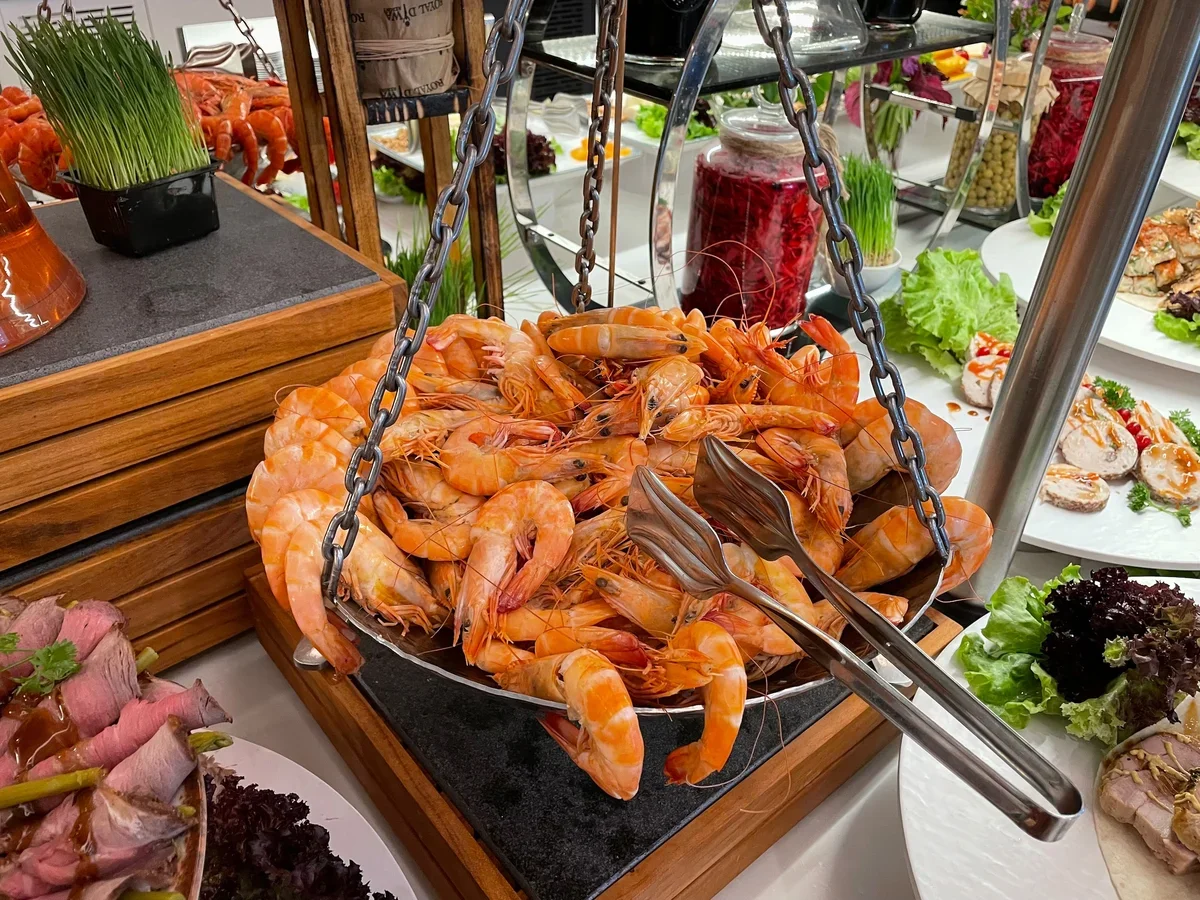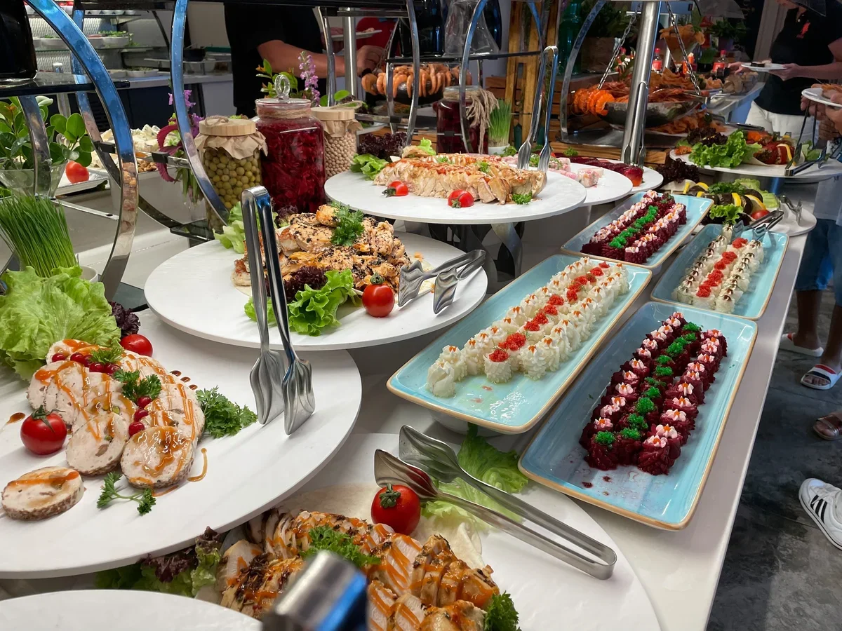 В ресторане удивило невероятное разнообразие очень красиво оформленных блюд шведского стола.