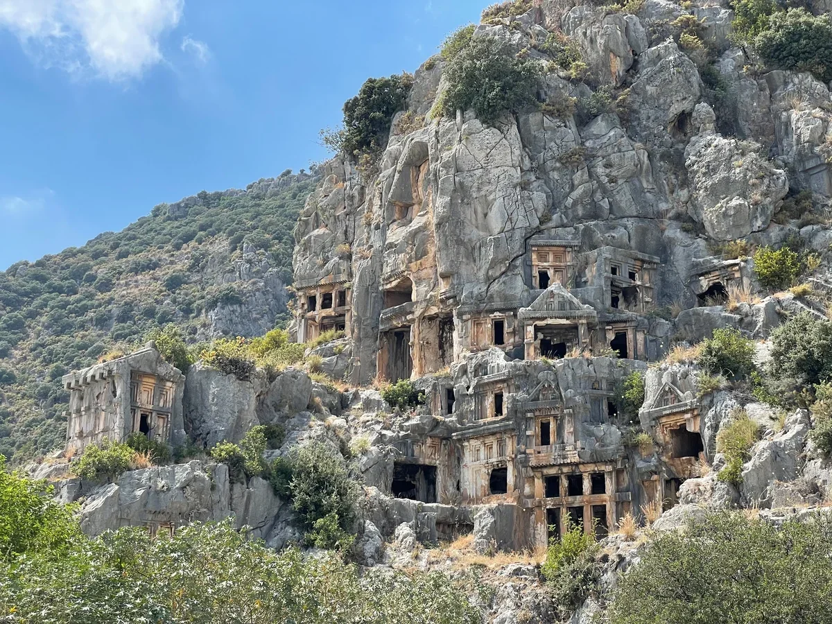 В Ликии много городов и некрополей, вырезанных в скалах. Один из самых известных – город Мира (Миры Ликийские) с саркофагами в скалах и причудливыми головами, вырезанными из камня.