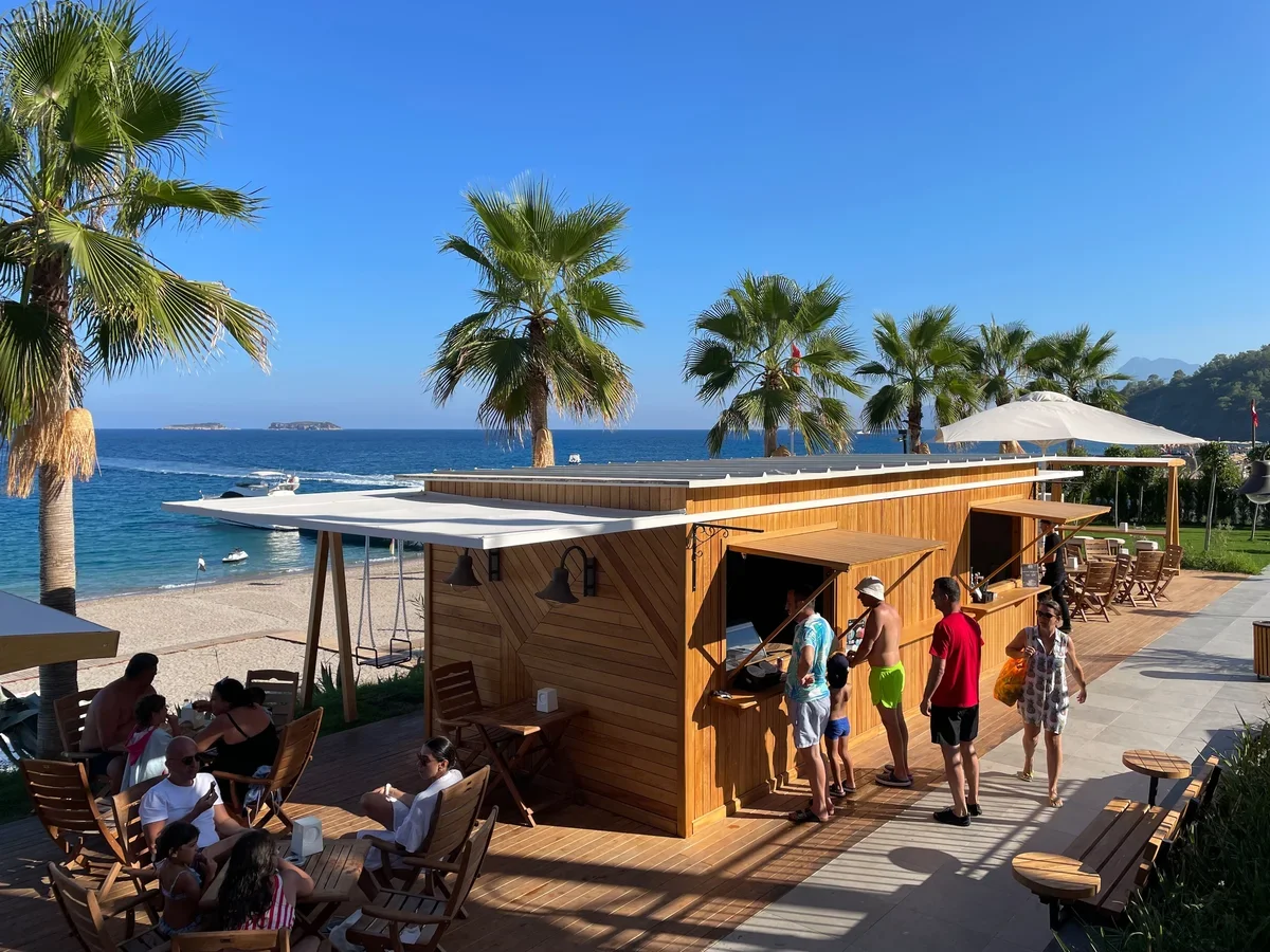 Между аквапарком и пляжем – несколько деревянных домиков с едой и напитками, оформленных в виде «зоны для пикника».