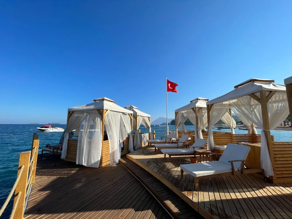 Также предусмотрены много отдельных кабан с холодильниками, но больше всего впечатляет пирс с баром, вип-кабанами и сетками, на которых можно лежать над водой и делать селфи в мальдивском стиле.