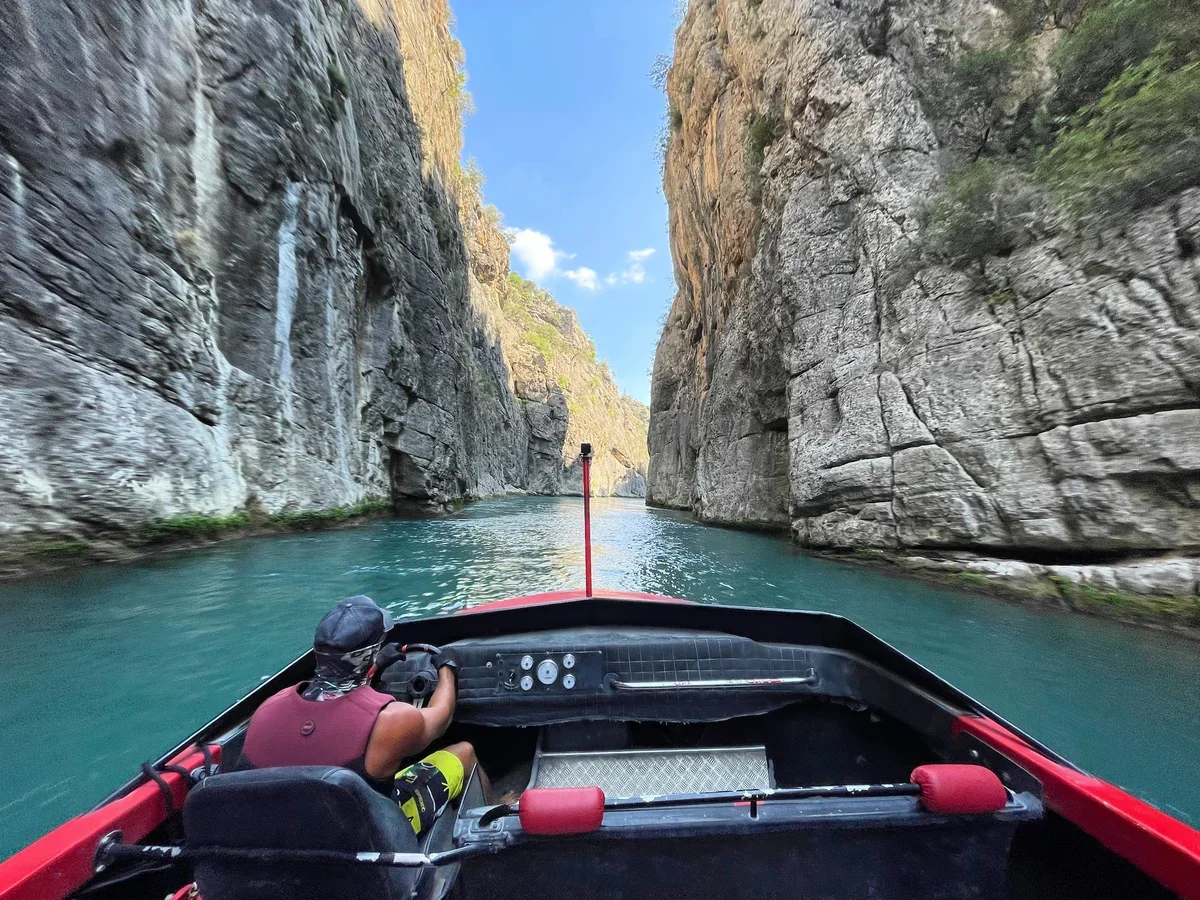 Катер идет настолько быстро, что буквально летит над водой почти касаясь отвесных скал каньона. Ощущения примерно как на американских горках, разве что он не падает вниз и не подлетает вверх. И мокро.
