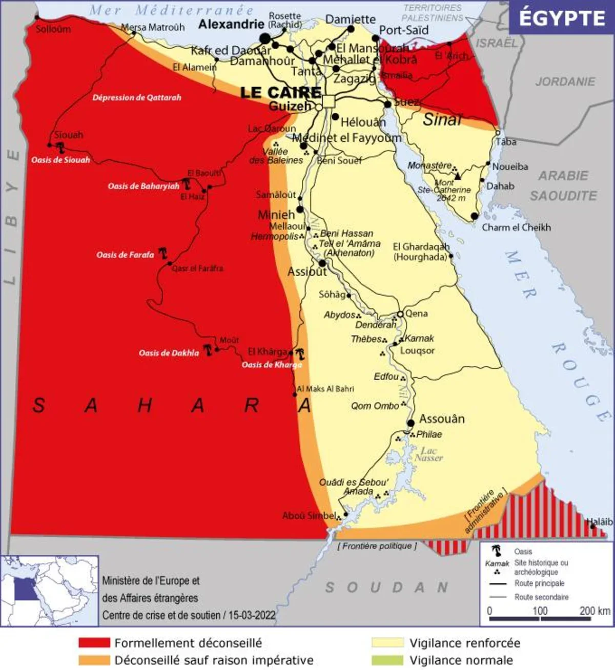Министерство иностранных дел Франции советует туристам быть осторожными в Египте уже несколько лет. Рекомендовано ездить не в пустыню в стороны Ливии и Судана, а также не посещать Северный Синай. К классическим туристическим зонам и центральным городам никаких вопросов в плане безопасности у МИД Франции нет.