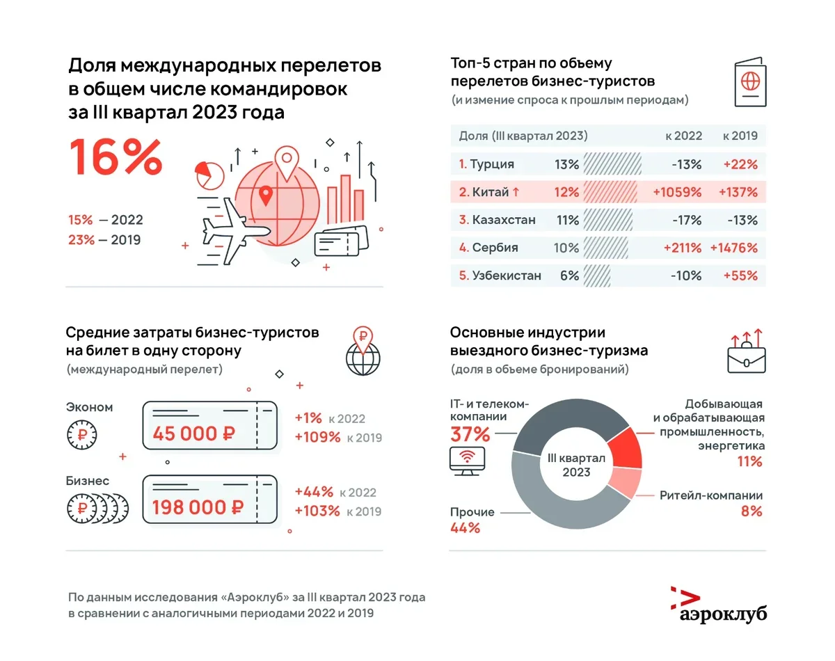 По данным исследования, в третьем квартале 2023 года деловые путешественники из России на 16% чаще приобретали авиабилеты за рубеж, чем годом ранее. Тем не менее, это все еще на 50% меньше, чем в допандемийном 2019 году.