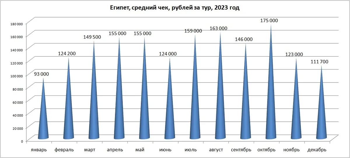 «Провалы» в среднем чеке туров в Египет в ноябре и декабре можно объяснить появившимися из-за ближневосточного конфликта скидками, сентябрь же традиционно самое выгодное время для отдыха в Египте в плане цен.