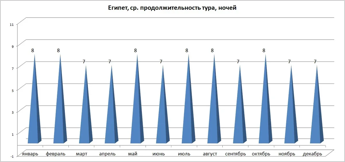 Интересно, что при всем этом средняя длительность тура на направлении очень слабо коррелируется с размером среднего чека по месяцам: направление в большей степени зависит от курса валют и волн спроса, а также объемов перевозки. Подавляющее большинство туров в Египет – с перелетом, доля наземного обслуживания невелика.