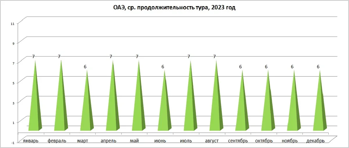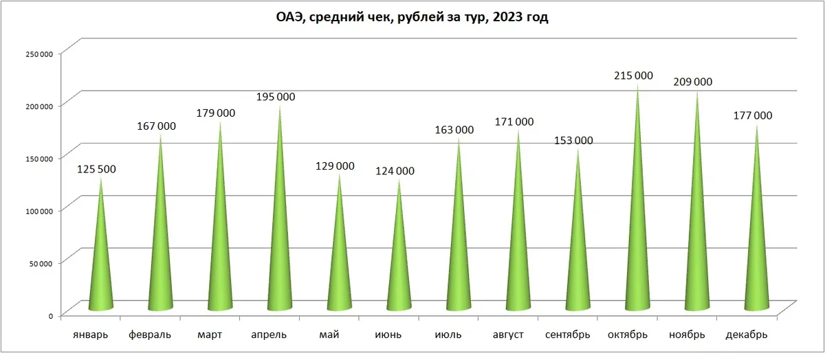 Но июнь и июль (самые жаркие месяцы в Эмиратах) также показывают рост среднего чека: это в 2023 году явное следствие повышенного спроса со стороны тех туристов, кто искал альтернативы подорожавшей Турции.