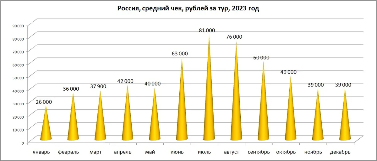 Сразу поясним: средний чек тура в определенный месяц – это не цена в системе туроператора, а среднее арифметическое сумм реальных продаж туров за месяц (и в каждом из этих туров может быть разное количество человек, разная длительность, разные отели, перелет или только отель и т.п.).