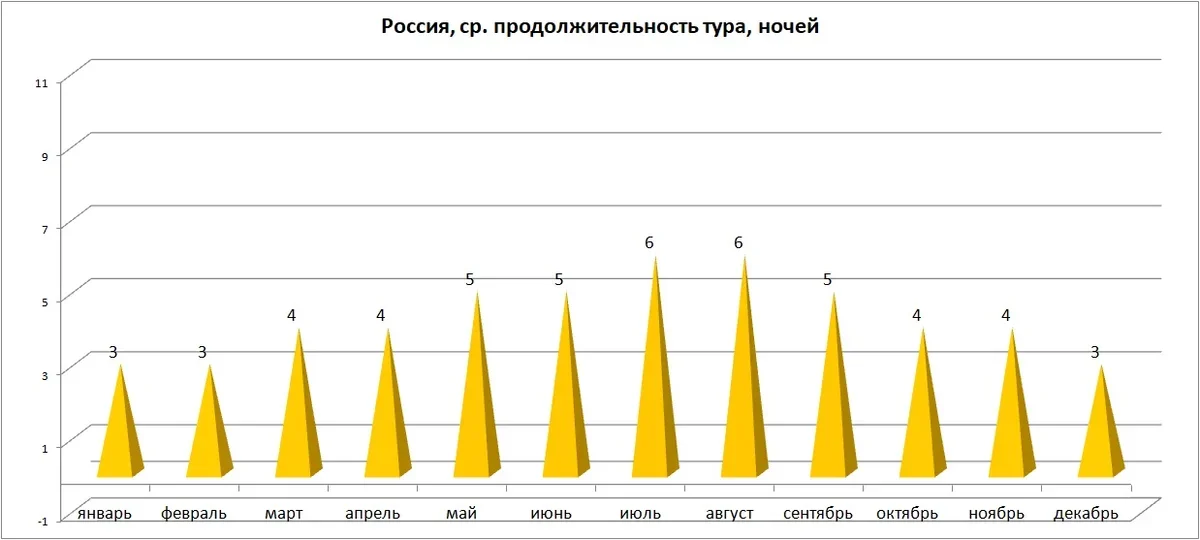 Четыре месяца с наименьшей стоимостью ночи в чеках туров по России – май (8 000 р.), январь (8 666 р.), март (9 475 р.) и ноябрь (9750 р.).