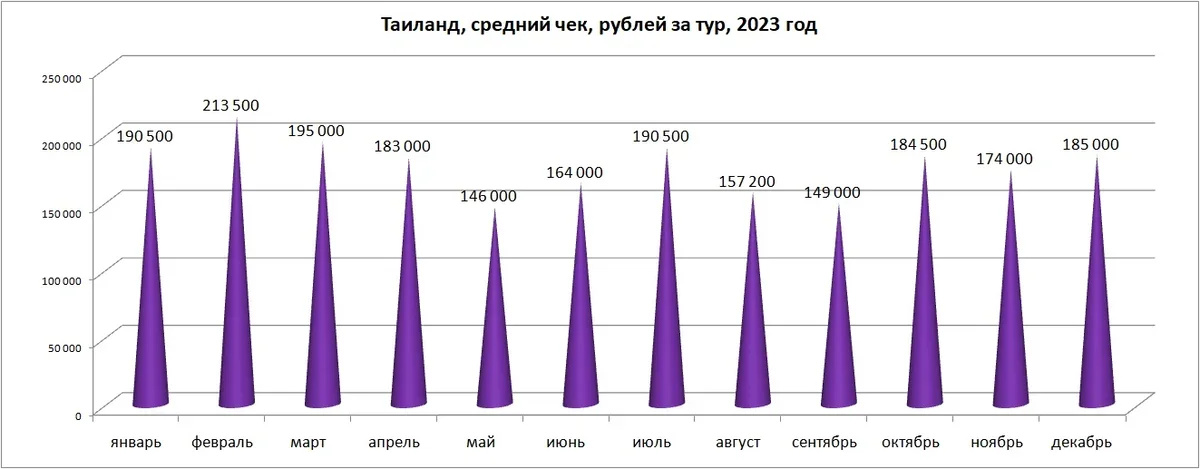 В 2023 году средний чек (т.е. траты на отдых) на таиландском направлении в большей степени зависит не от валютного курса (средний чек тура осенью и в декабре, при высоком курсе доллара, меньше, чем в январе-апреле, когда курс был гораздо лучше), а от объемов перевозки и сохраняющейся сезонности. Это хорошо видно при сравнении диаграмм.
