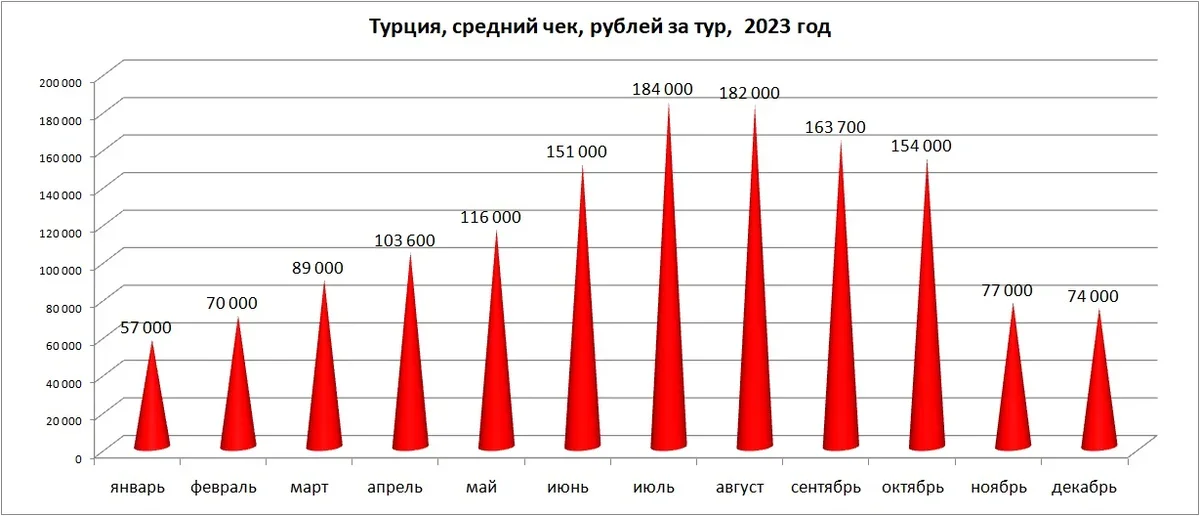 Средний чек, вместе со средней продолжительностью туров, растет в месяцы высокого летнего спроса и снижается в межсезонье, достигая минимума зимой, когда поездки в Анталью замещаются короткими турами в Стамбул.