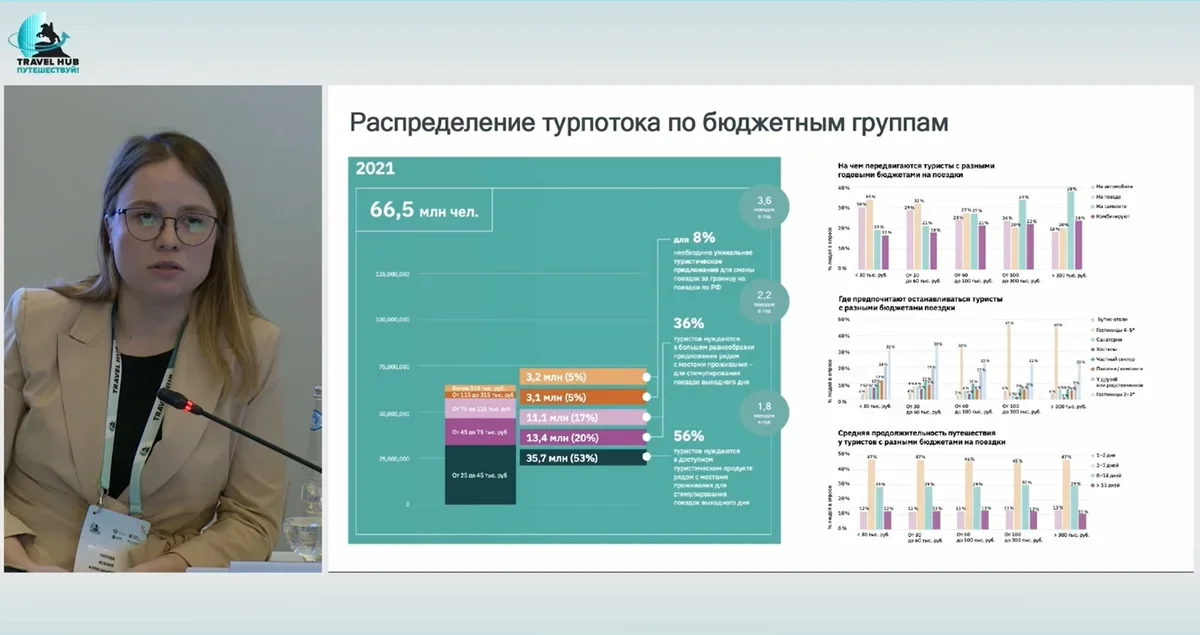 Главным выводом, по словам г-жи Титовой, стало понимание, что основу развития туризма в России составляют путешественники с бюджетом максимум 75 тыс. рублей на человека в год – именно они совершают большую часть из общего количества поездок.
