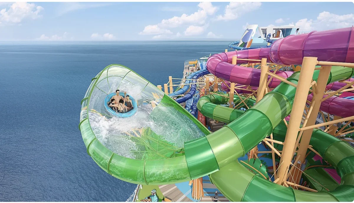 Главной «фишкой» Icon of the Seas станет самый большой на море аквапарк Thrill Waterpark. В нем будет 6 горок разной высоты и сложности, в т.ч. первая на круизном лайнере открытая горка свободного падения.