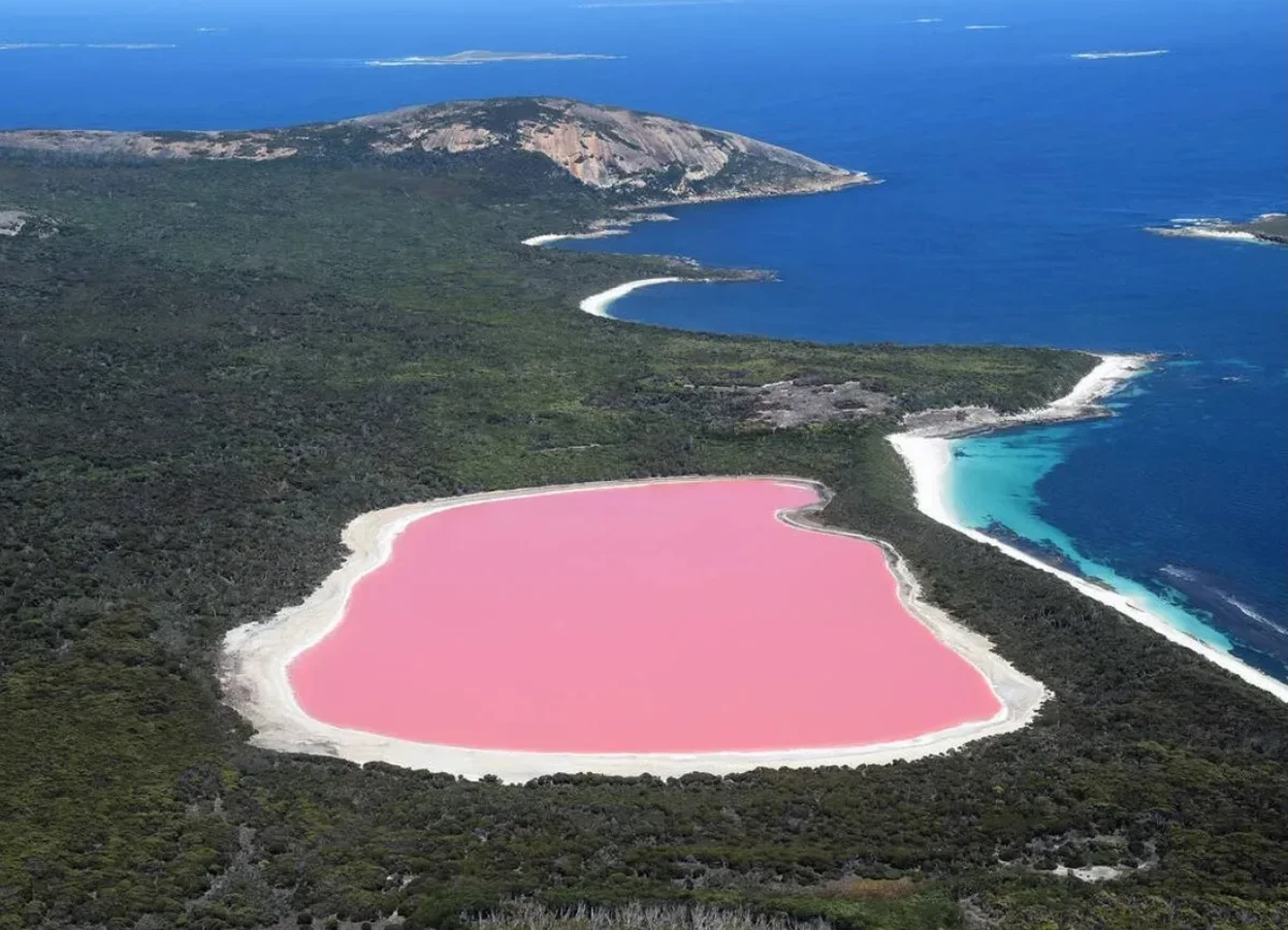 Озеро Хиллер (Lake Hillier), Австралия. Самое необычное озеро в мире. И очень-очень соленое. Ярко-розовый оттенок придают водоросли, галобактерии и другие микроорганизмы. Из-за высокой концентрации солей заходить в воду лучше не стоит.