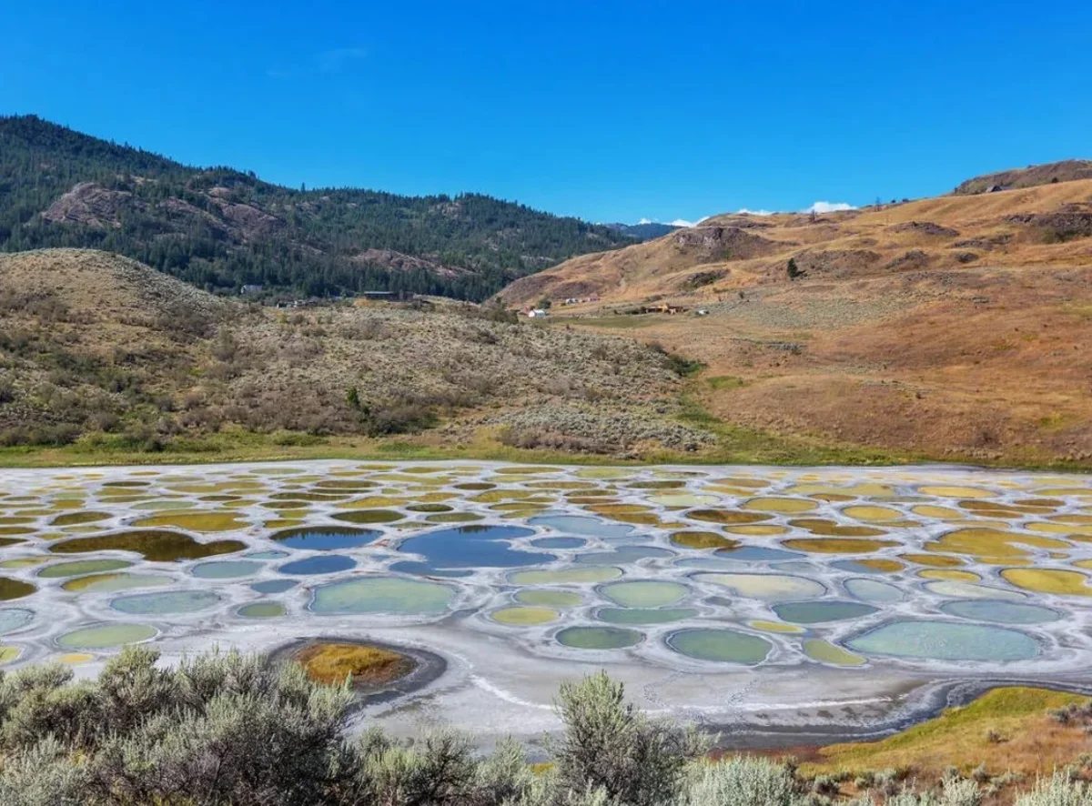 Пятнистое озеро (Spotted Lake), Канада. Спрятанное в Британской Колумбии, оно выглядит как в фантастических фильмах. Но все объяснимо: небольшой водоем богат различными минералами, от массы сульфатов кальция и натрия до небольших количеств серебра и титана. Летом, когда вода испаряется, остается странная коллекция отложений, давшая Пятнистому озеру свое название.