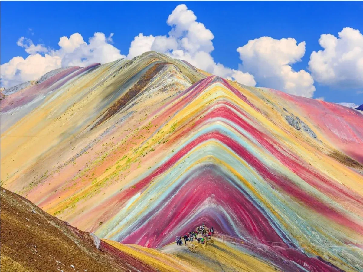 Гора Виникунка (Vinicunca), Перу. Эта гора выглядит как из психоделического сна. Уникальный вид разноцветного мрамора Виникунки является результатом осадочных отложений на протяжении веков. Чтобы подняться на гору, потребуется около четырех часов, в зависимости от того, как часто захочется останавливаться, чтобы полюбоваться на эту красоту.