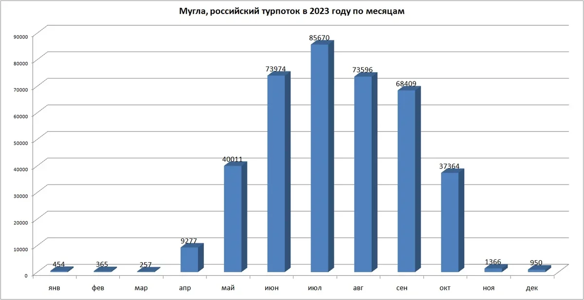 Она приняла по итогам 2023 года 391 693 туриста из России, что только на 8,1% больше, чем в 2022 году. Доля Муглы в российском турпотоке в Турцию в 2023 году – 6,2%.