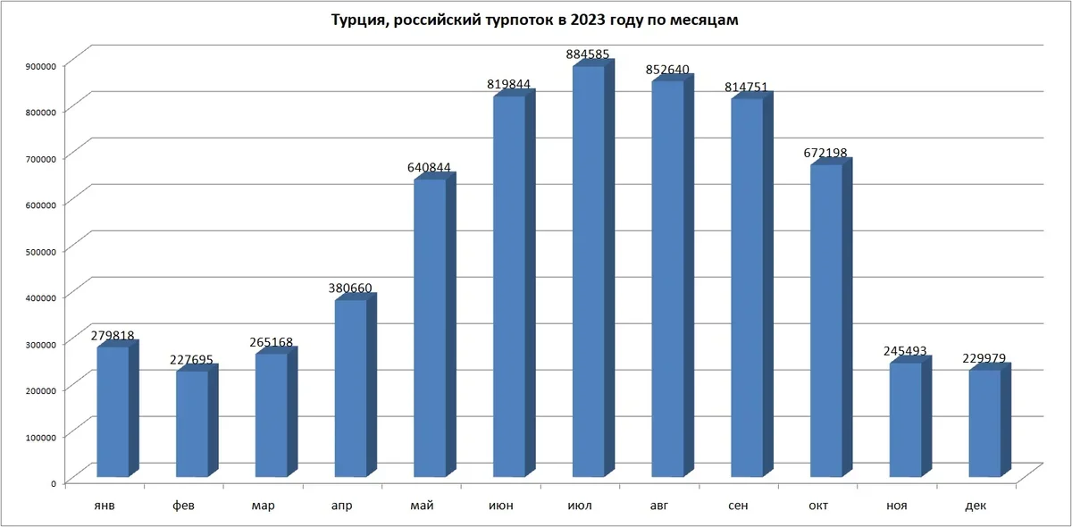 Влияние транзитного фактора на российский турпоток в Стамбул доказывается и помесячной динамикой турпотока из РФ в Стамбул в 2023 году.