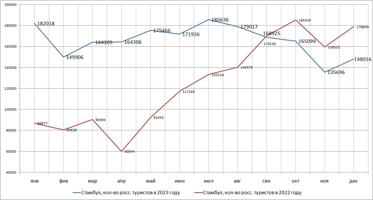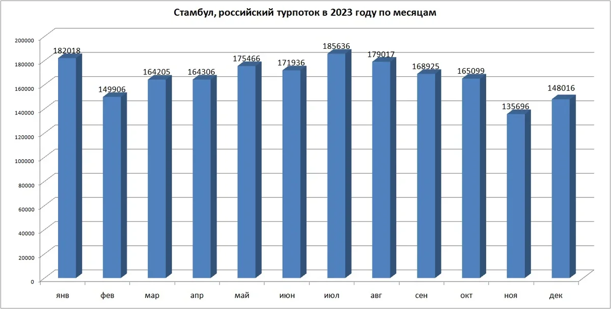 Влияние транзитного фактора на российский турпоток в Стамбул доказывается и помесячной динамикой турпотока из РФ в Стамбул в 2023 году.
