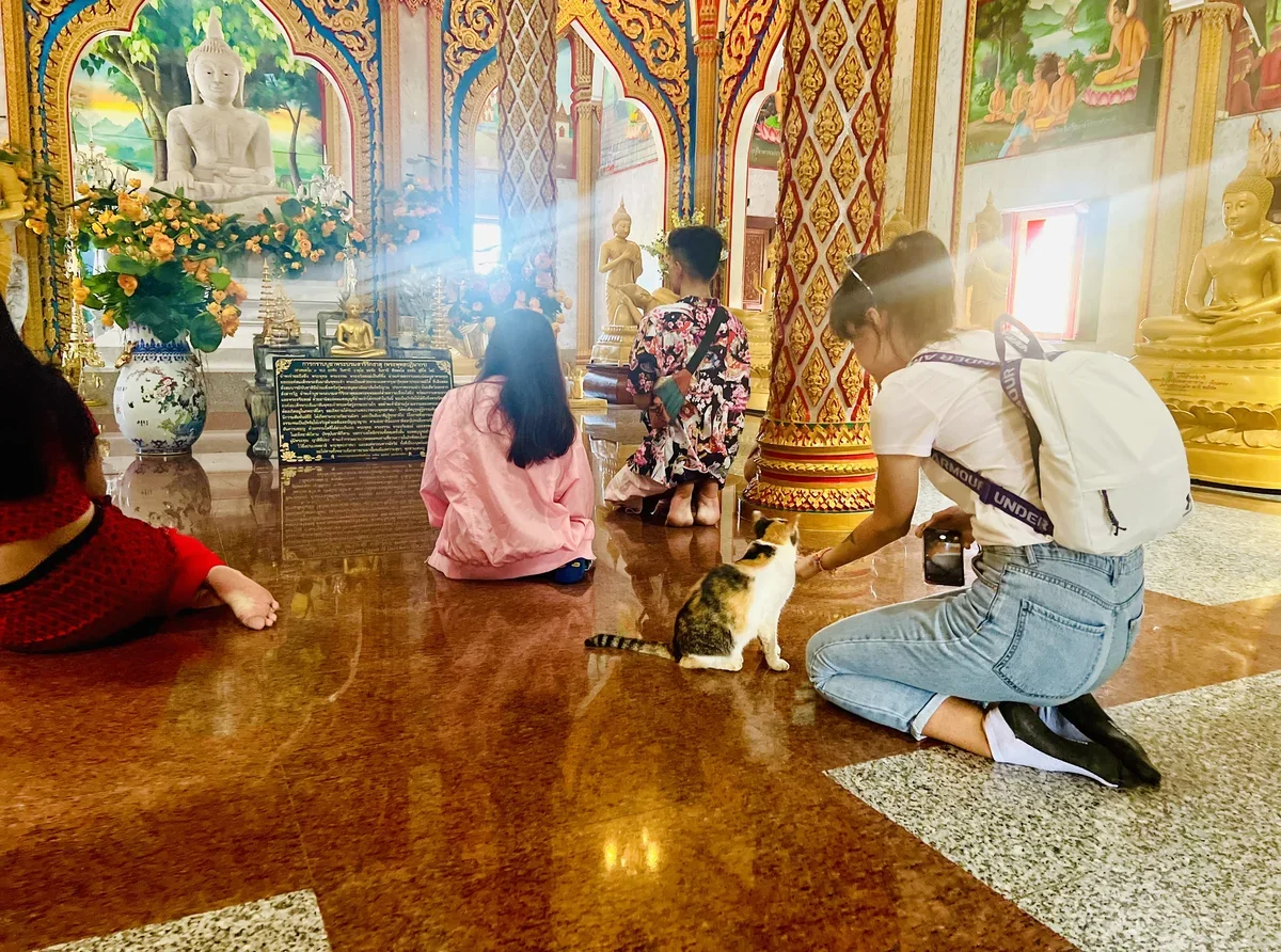 А кошки в Таиланде вообще настоящие хозяюшки. И работать в магазинах помогают, возлегая на кассе, и в храм вместе с людьми ходят.