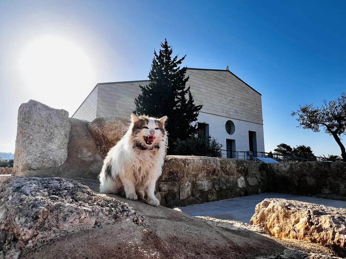 А вот с боевой кошечкой, живущей на горе Небо, можно и пошутить. А лучше поболтать с ней. Дама очень разговорчивая. Не прекращала вещать историю уникального места даже во время фотосессии на фоне храма Моисея, где хранятся бесценные мозаики, датируемые 530 годом.
