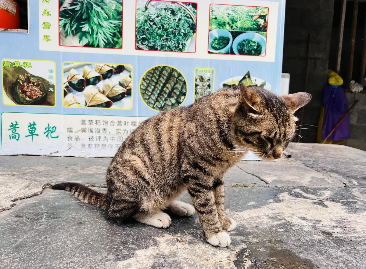 На одной из заправок, по дороге из города Чжанцзяцзе, что в провинции Хунань, в древний город Фэнхуан, встретили кошку. Она сидела у стенда, рекламирующего еду, то есть сразу дала понять, что хочет есть. Желаемое, само собой, получила. Подзывают кошек в Китае так –«ми-ми-ми».