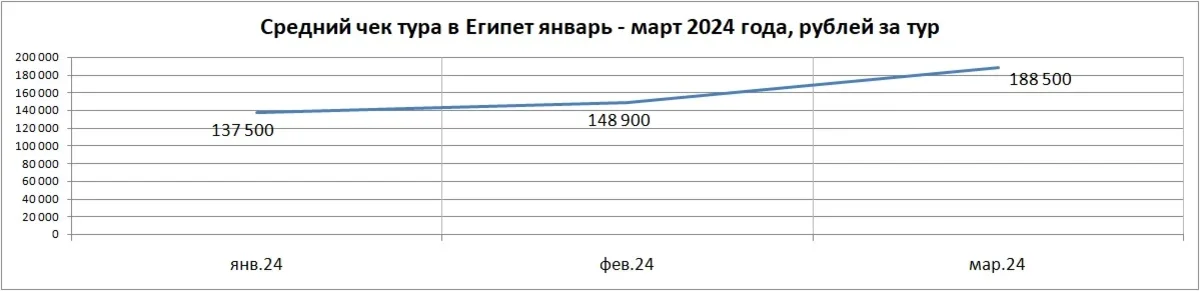 Средний чек тура в Египет в марте 2024 года – 188 500 руб. за турпакет с перелетом (прирост на 26,6%, в феврале средний чек был 148 900 руб.). Средняя длительность отдыха – 8 ночей (такая же была и в январе, и в феврале).