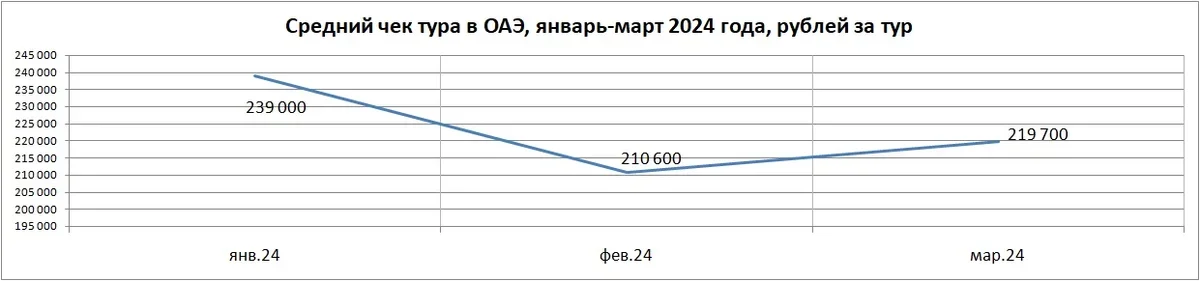 Средний чек тура в ОАЭ в марте 2024 года – 219 700 руб. за турпакет с перелетом (прирост на 8,1%, в феврале средний чек был 210 600 руб.). Средняя длительность отдыха – 7 ночей (такая же была и в феврале).
