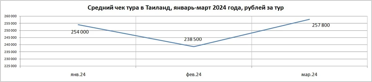 Средний чек тура в Таиланд в марте 2024 года – 257 800 руб. за турпакет с перелетом (прирост на 8,1%, в феврале средний чек был 148 900 руб.). Средняя длительность отдыха – 11 ночей (такая же была и в феврале).