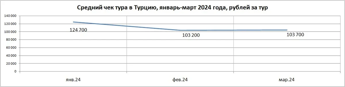 Средний чек тура в Турцию в марте 2024 года – 103 700 руб. за турпакет с перелетом (в феврале средний чек был 103 200 руб., прироста почти нет). Средняя длительность отдыха – 6 ночей (такая же была и в феврале).