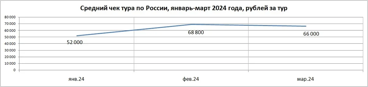 Россияне предпочитают в марте в основном недлительные поездки. Средняя длительность отдыха в России в марте – 5 ночей (такая же была и в феврале). Средний чек тура по России (в основном это туры без перелета, только отель) в марте 2024 года – 66 000 руб. за тур (меньше на 3%, чем в феврале, когда средний чек был 68 000 руб.).