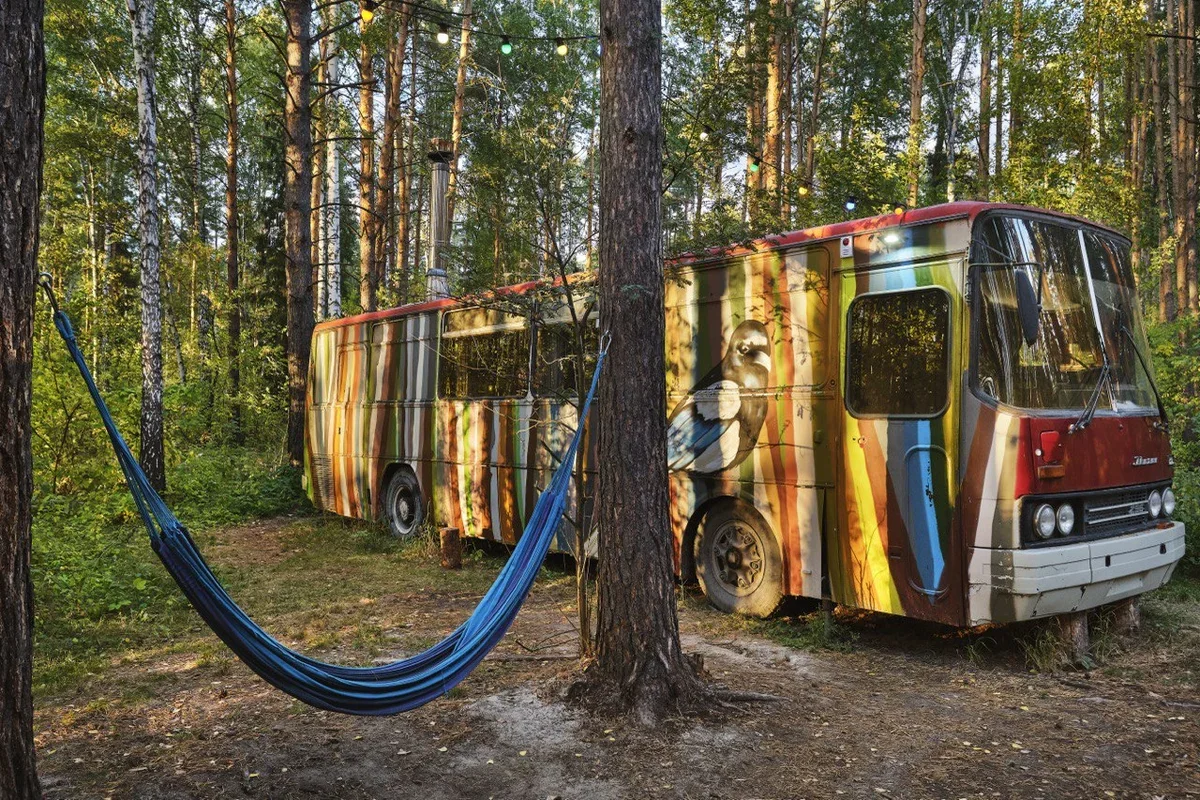 Здесь туристов ждет теплый и аутентичный икарус-дом. Да, настоящий автобус, с легкой руки дизайнеров превратившийся в отель. В автобусе-отеле нет кресел. Зато есть большая уютная кровать, мини-кухня, мягкие пуфы. Рядом – мангальная зона, стол, гамаки. Баня и туалет тоже здесь – на улице.