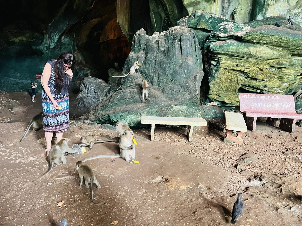 Стоит ли бояться обезьян? Нужно быть осторожными. Обезьяны темпераментные и бывают весьма опасны. Если из личного опыта. У меня была настоящая дружба с обезьянами в Индонезии. Сколько у нас было сделано совместных фото. А вот с обезьянами в Китае дружбы не сложилось. После чего эти животные начали вызывать страх. Так продолжалось много лет. До того момента, пока в нашей поездке с Anex мы не попали в пещерный храм Ват Суван Куха, что в провинции Пханг Нга.