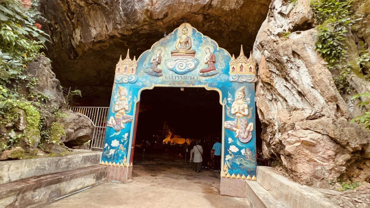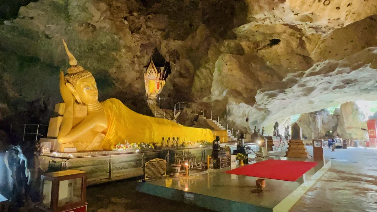 Древний Ват Суван Куха часто называют пещерой обезьян. Они там повсюду. Бегают у входа в храм, в пещере. Их нет разве что только у расположенной в центре храма статуи лежащего Будды, точной копии Будды в Бангкоке в Ват Пхо.