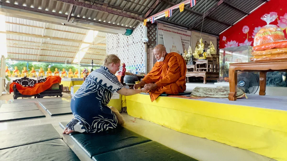Перед тем, как подниметесь к Будде, при желании, можно пойти к монаху, который повяжет вам на руку защитную ниточку «сай син» на удачу. Любимая традиция туристов, кстати. Пока монах вяжет ниточку, можно загадать желание. Если верить туристам, Таиланд умеет их исполнять.