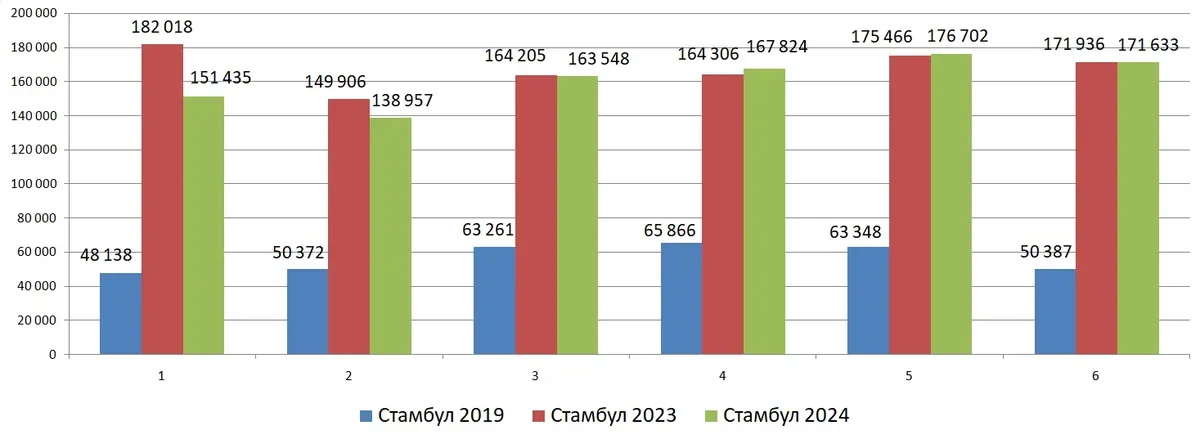 С марта месячные объемы турпотока в Стамбул из России практически повторяют прошлогодние цифры. Так, в июне 2024 года в этот турецкий мегаполис прибыли 171 633 туриста – всего на 303 человека меньше, чем в июне 2023-го (171 936).