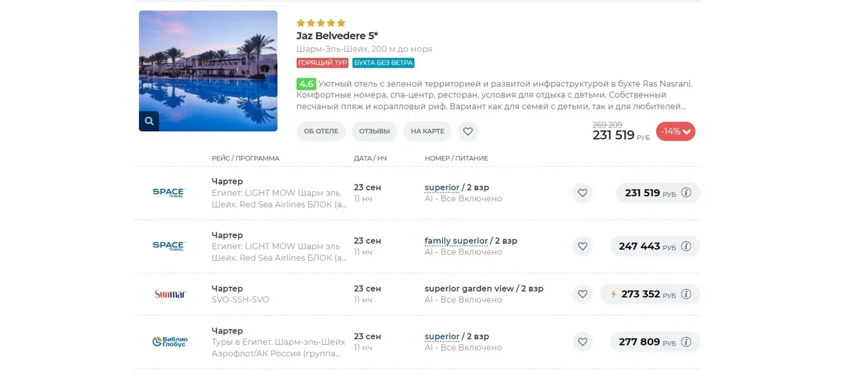 По меньшей мере, сейчас в поиске сервиса «Турвизор» аналогичные предложения других игроков по первым четырем отелям из списка стоят на 20–45 тыс. рублей дороже, и по отелям уровня «люкс» экономия в случае туров Space Travel тоже есть – от 2 до 40 тыс. руб.