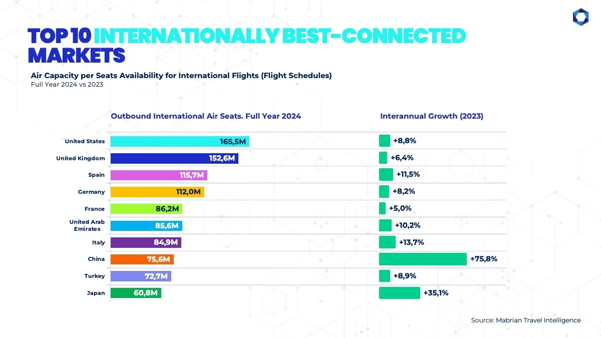 «Заслуживают особого упоминания Турция и Объединенные Арабские Эмираты. Турция, один из ключевых узлов связи между Европой и Азией, увеличивает объем кресел на +8,9% в годовом исчислении. ОАЭ также укрепляют свои позиции в качестве связующего звена на Ближнем Востоке, занимая шестое место с 85,6 млн мест, доступных на международных рейсах, и межгодовым ростом +10,2%», – говорят авторы рейтинга.