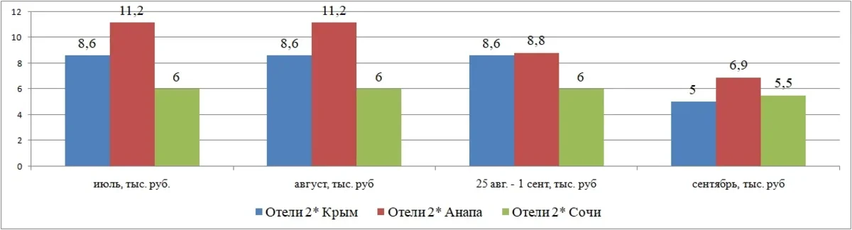 Из сопоставления цен на двухзвездочные объекты видно, что в бюджетных отелях 2* в летние месяцы дешевле было отдыхать в Сочи (примерно на треть дешевле, чем в Крыму и еще больше разница с Анапой).