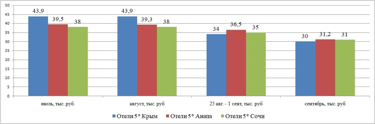 Согласно цифрам аналитиков, летом отдых в Крыму летом оказался дешевле на 10-12%, чем в Краснодарском крае, если туристы выбирали отели 1* и «без звезд». Отели 3* с завтраками в летние месяцы были в Крыму дешевле, чем в Сочи на 30-39%, а отели 4* – на 20% (в сентябре выгоднее всего, на 40% дешевле Сочи).